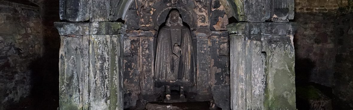 The Dennistoun Memorial is one of the most eye catching on the East Wall of the Kirkyard. As a result it was a particular favourite of early Edinburgh photographers such as David Octavius Hill and Robert Adamson. The memorial is dated 1626 and when raised it certainly broke new ground on the design of mural monuments at Greyfriars. Before this one, all of the earlier mural monuments are relatively conventional and quite formulaic. But Sir Robert Dennistoun had spent 30 years in Holland absorbing the style and designs that flourished there. He must have brought those ideas and images back to Scotland and used them to heavily influence the style of his own monument. I believe William Wallace was the Master Mason on this work, taking over from John Simpson who had carved the earlier examples on the East Wall between 1610 and 1620 which all are niche tombs with pilasters (where the columns are integrated in the stonework and not separate load bearing columns). This style was a copy of monuments that the wealthy had commissioned inside the Churches of Scotland for a century or more before the Reformation, often with an armour wearing Knight lying in the niche.
